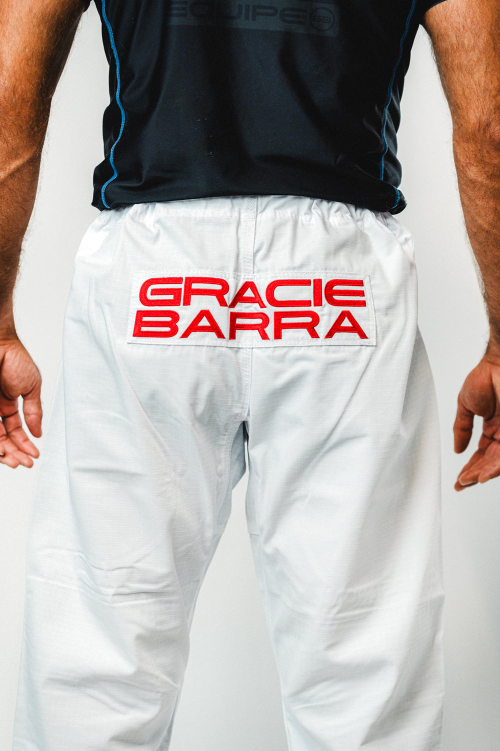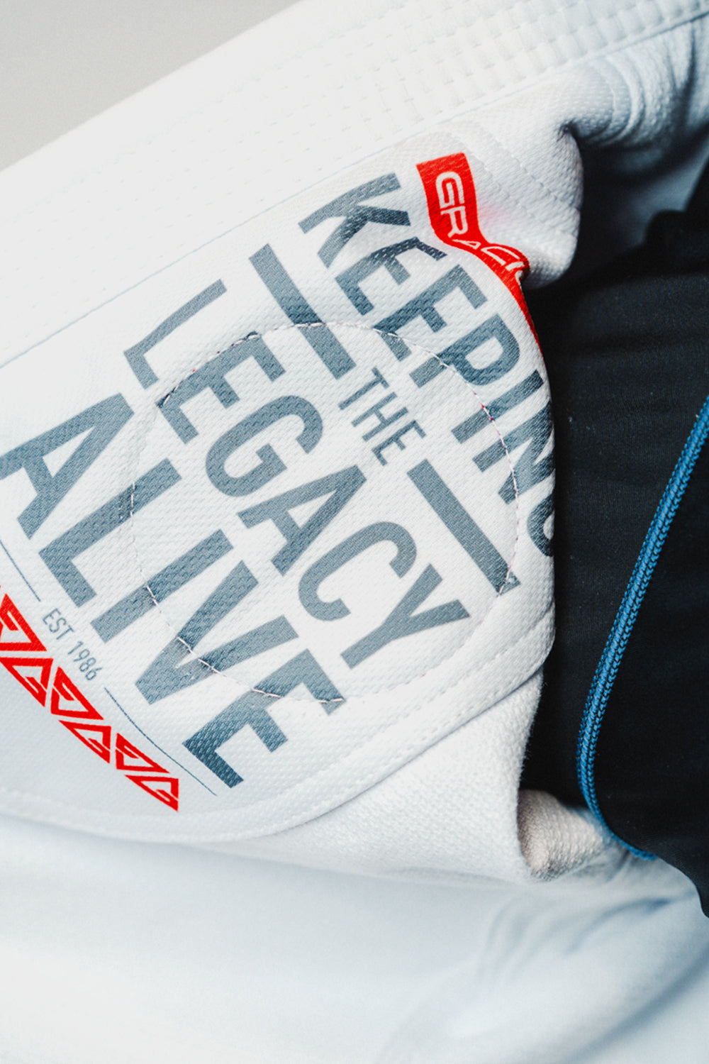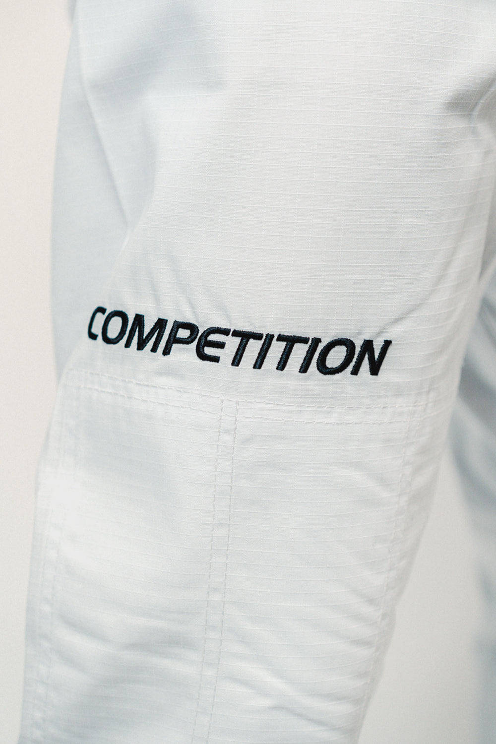 Confeccionado com tecido pré-encolhido industrialmente antes do corte, podendo ocorrer um encolhimento residual de até 3,5% nas primeiras lavagens em virtude da acomodação da modelagem ao corpo do lutador