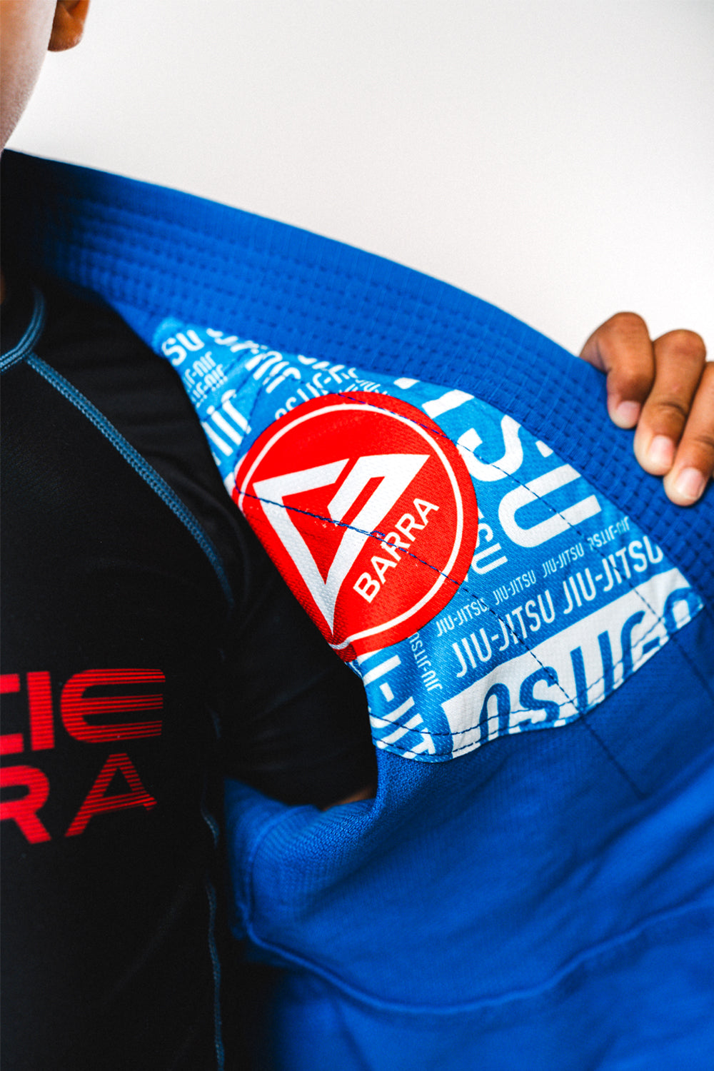Confeccionado com tecido pré-encolhido industrialmente antes do corte, podendo ocorrer um encolhimento residual de até 3,5% nas primeiras lavagens em virtude da acomodação da modelagem ao corpo do lutador