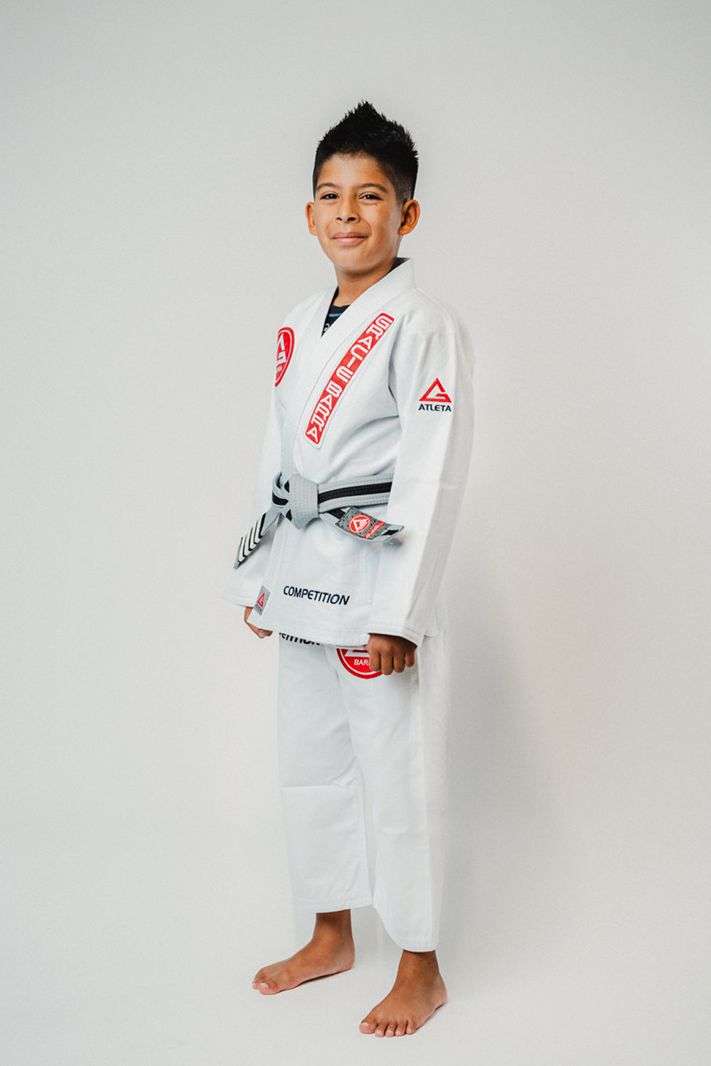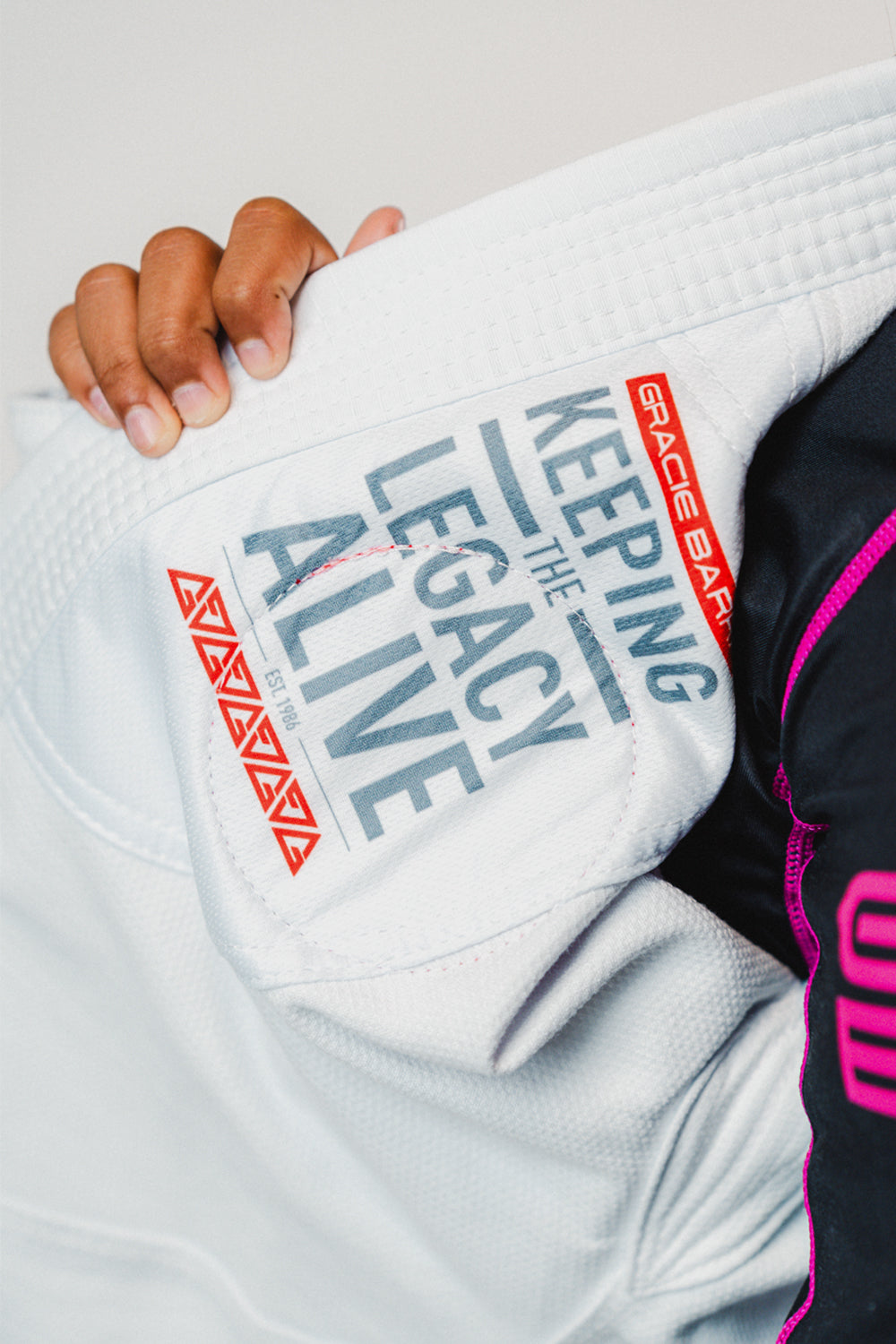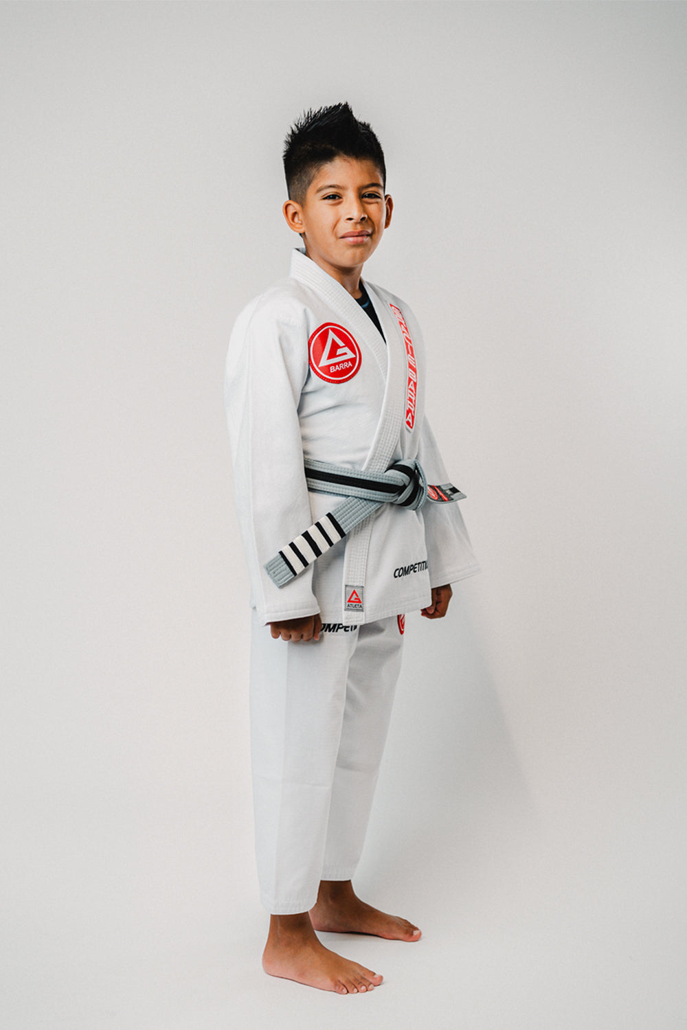 Confeccionado com tecido pré-encolhido industrialmente antes do corte, podendo ocorrer um encolhimento residual de até 3,5% nas primeiras lavagens em virtude da acomodação da modelagem ao corpo do lutador