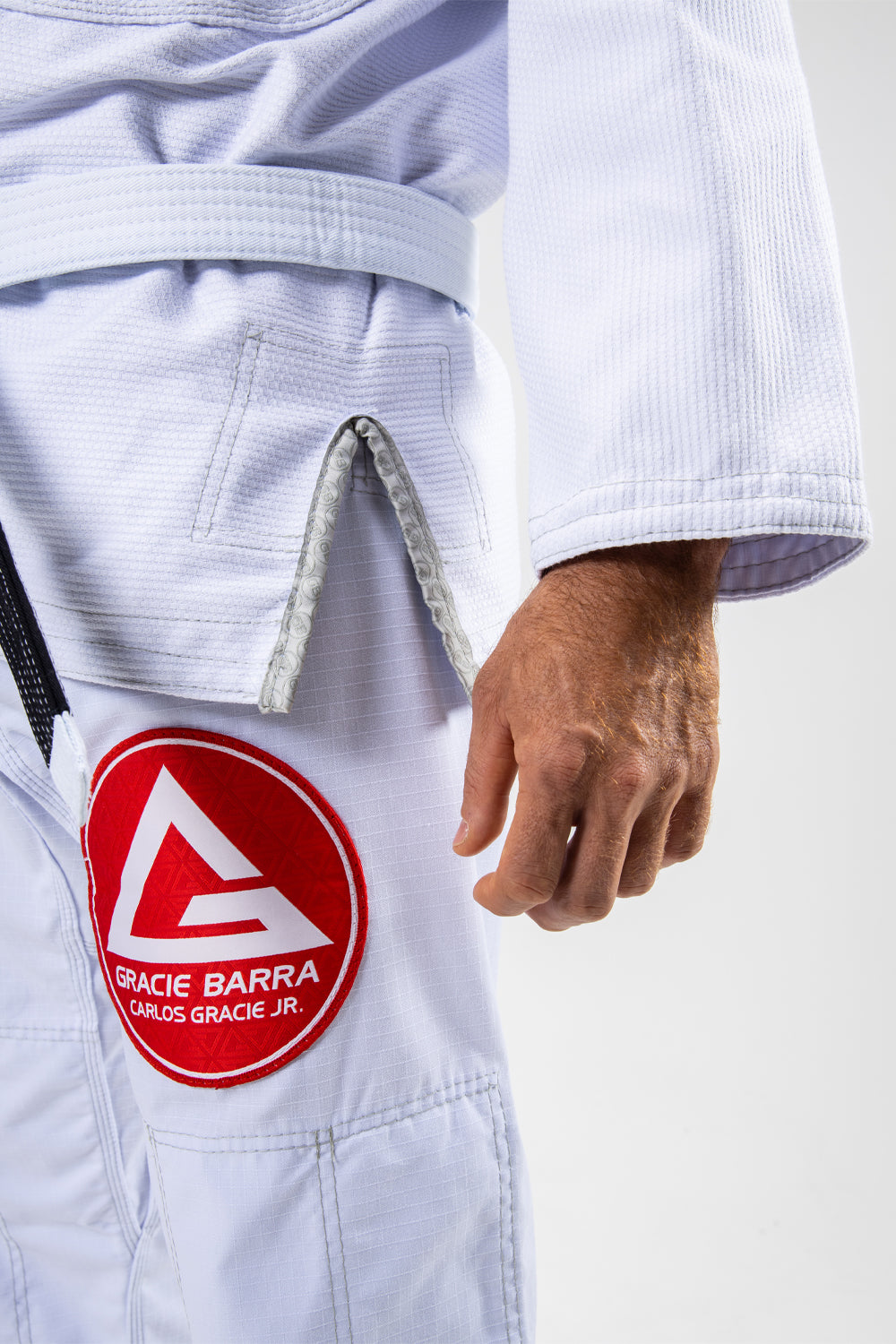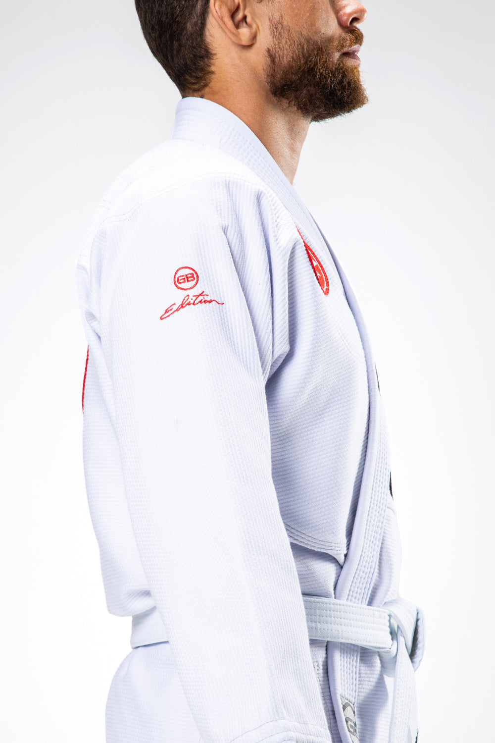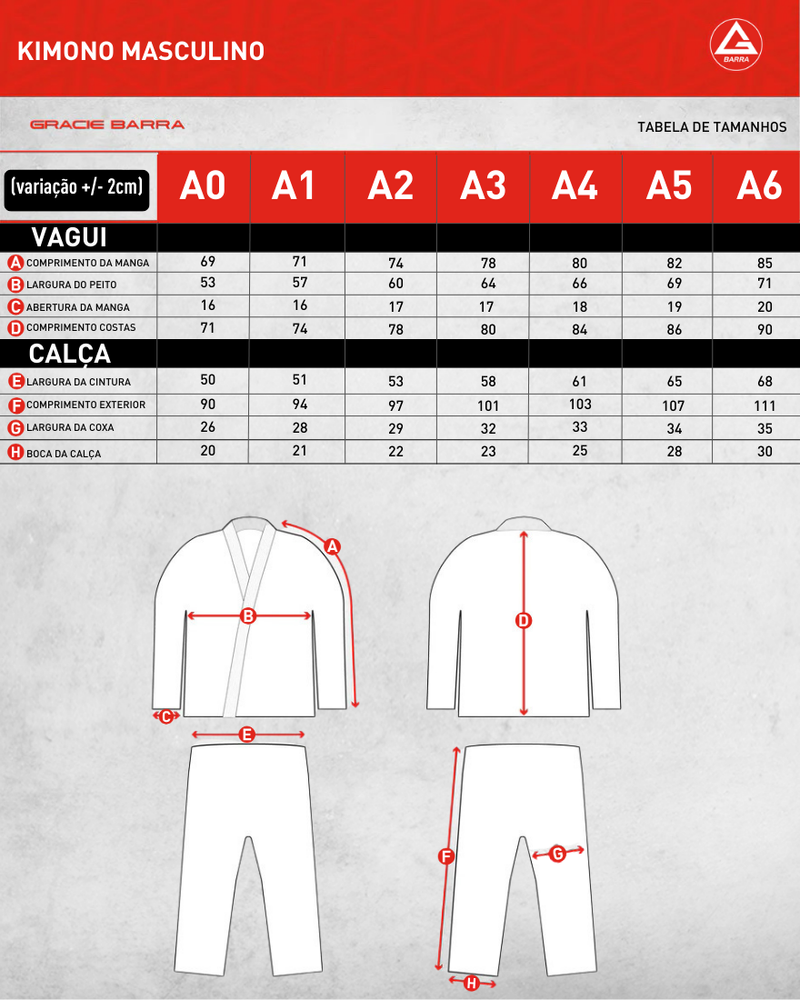 Confeccionado com tecido pré-encolhido industrialmente antes do corte, podendo ocorrer um encolhimento residual de até 3,5% nas primeiras lavagens em virtude da acomodação da modelagem ao corpo do lutador